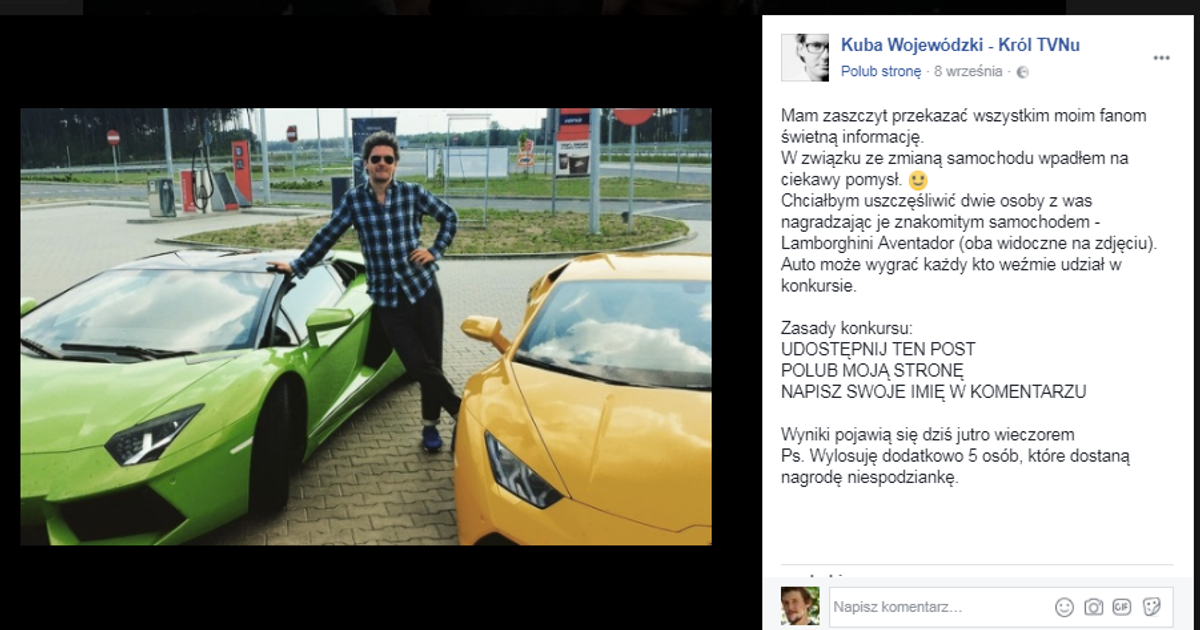 Kuba Wojewódzki Lamborghini : : To konkurs, w którym nie warto brać udziału.. Do tej pory lamborghini zajmowało się produkcją sportowych maszyn i traktorów. Kuba wojewódzki jeździ lamborghini urus. Ostatnio znany showman umieścił na swojej stronie zdjęcie rozbitego lamborghini aventador. Wojewódzki ogłosił konkurs, którego zasady są banalnie proste, a z udostępnionych postów konkursowych wybierze dwójkę zwycięzów. Dodatkowo kuba wybierze 5 osób, które otrzymają.